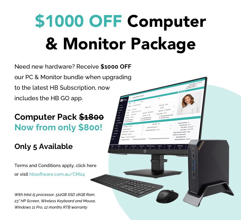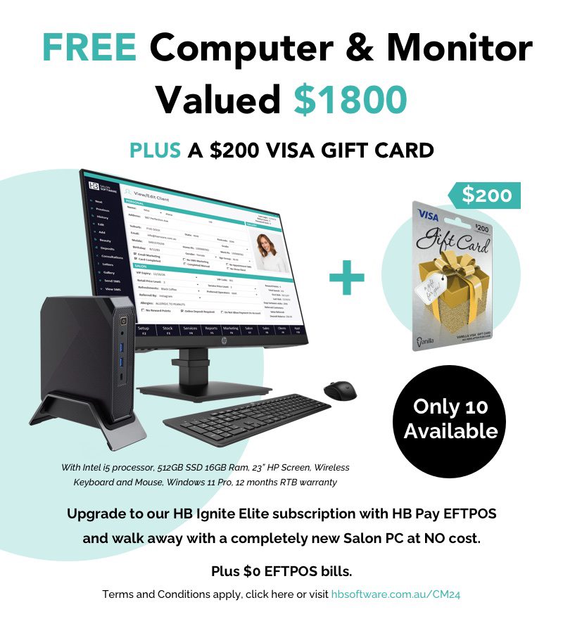 Free Computer Terms and Conditions. Available to new and existing customers that do not already have a Hairware Beautyware subscription and sign up to the Elite subscription package, costing only at $52.90 per week plus GST, must be transacting within 60 days using the HB Pay EFTPOS Terminal with a minimum average turnover of $20,000 per month for a minimum of 6 months.  Limited to the first 10 customers only. Not valid with any other discounts or promotions. Offer expires 8th December 2024 or whilst stock lasts.
