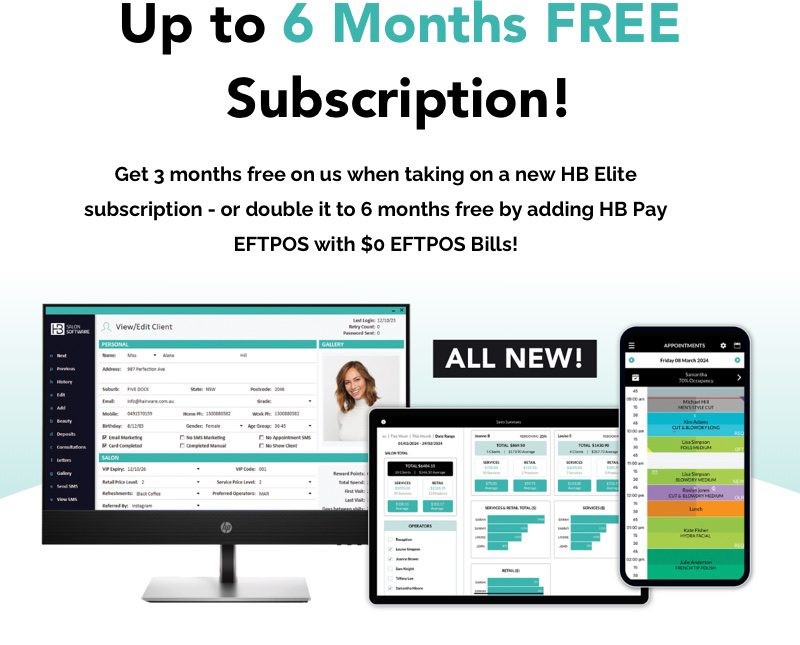 Three months Free Terms and Conditions. Available to new and existing customers that do not already have a Hairware Beautyware subscription and sign up to the Elite subscription package, costing only $52.90 per week plus GST. To receive the bonus three months free, you must be transacting within 60 days using the HB Pay EFTPOS Terminal with a minimum average turnover of $20,000 per month for a minimum of 6 months. Not valid with any other discounts or promotions. Offer expires 8th December 2024.